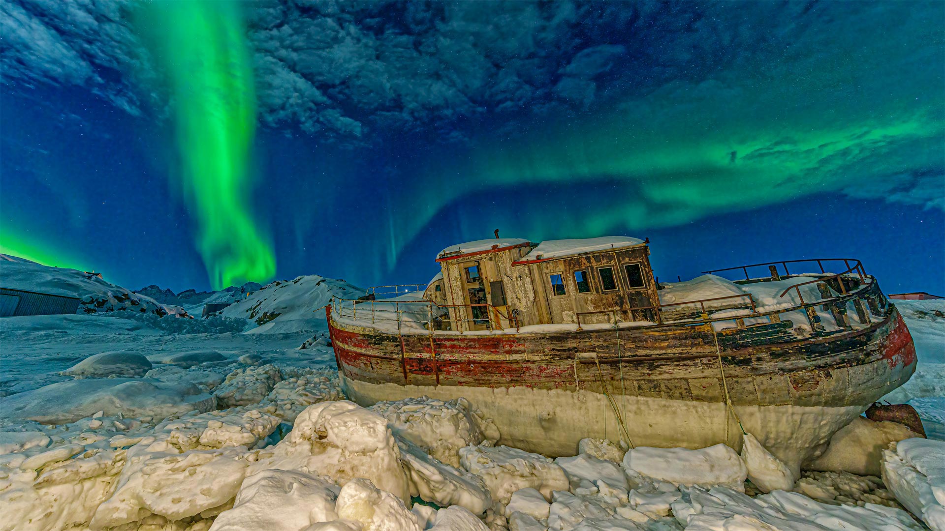 Northern lights over a stranded boat in Tasiilaq, 格陵兰 (© Shane P. White/Minden Pictures)